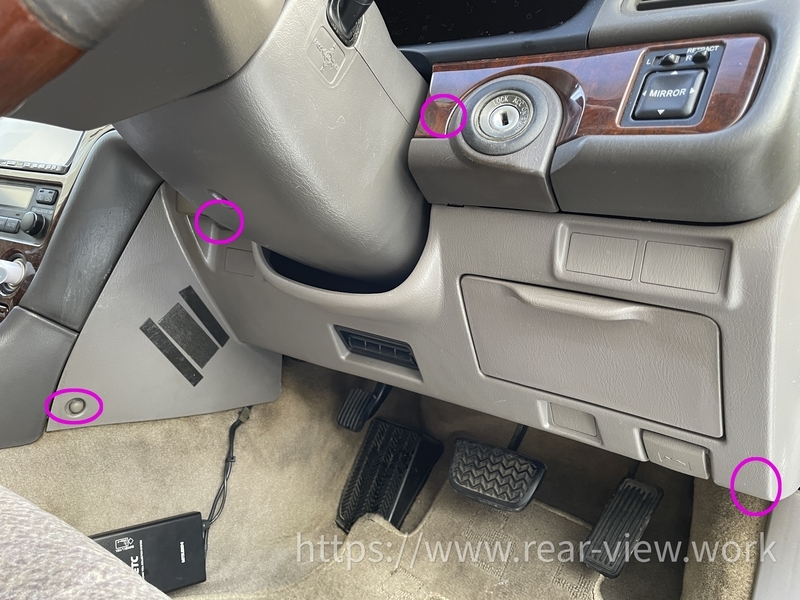 ステアリング下のカバーを外します。クリップの場所を大まかに◯で囲っています。